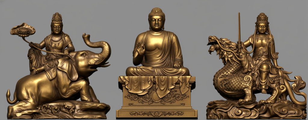 BỘ TƯỢNG ĐÚC ĐỒNG HOA NGHIÊM TAM THÁNH – BIỂU TƯỢNG PHÁP GIỚI, TRÍ TUỆ VÀ HẠNH NGUYỆN VIÊN MÃN